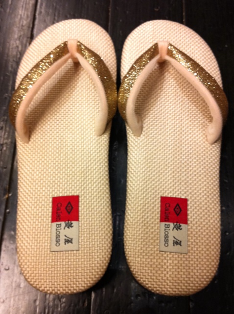 本日はスタッフのオーダー作品をご紹介致します。ご紹介するのは「花緒サンダル」です。ナイロンの台にグリッターの鼻緒を組み合わせているこの花緒サンダルは、ヌーディーな色合いで、大人っぽい仕上がりになっています。お洋服にも合わせやすい組み合わせで素敵ですね。