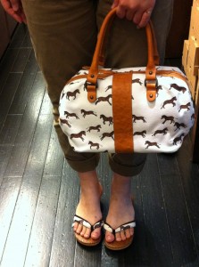 さて、本日はこれからの季節にもご活用頂けるコットンゼブラのロデム(税込21,840円)をご紹介いたします。白地に茶のゼブラス柄がプリントされた生地にキャメル色の革のラインが入ったこちらのロデムは、さわやか且つ大人っぽい仕上がりになっております。いかがでしょうか?同じ生地を使った花緒サンダルのご用意もあるので、履物とバッグをお揃いにしても面白いかもしれません。