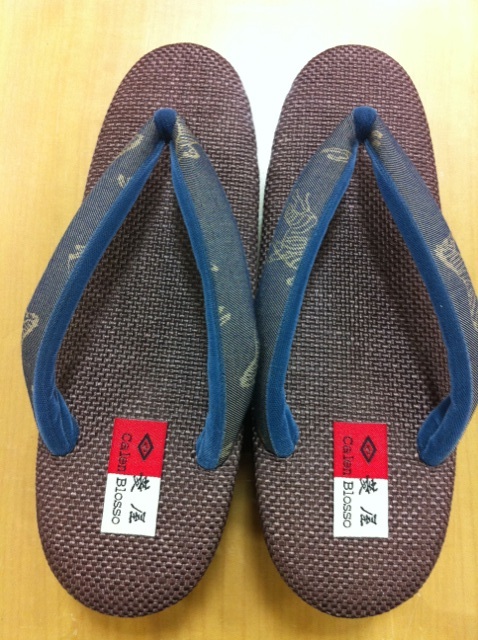 さて、本日はお客様のオーダー作品「花緒サンダル」をご紹介いたします。ココア色のEVAとナイロンの天生地、鼻緒はシマウマ柄の綾織、本天は青という組み合わせです。お気づきの方もいらっしゃるかと思いますが、花緒サンダルの定番商品「№070」の本天を青に変えたものがこちらの花緒サンダルです。本天の色を変えるだけでここまで雰囲気が変わるのですね。定番の№070も好みですが、本天を青に変えたこちらの花緒サンダルもかなり好みです。ちなみに、皆さんはどちらが好みでしょうか?