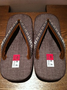 組み合わせは、EVA:ココア、天(足を乗せるところ):ナイロンこげ茶、鼻緒:200C(献上博多織の華皿)、鼻緒受け:茶色です。