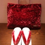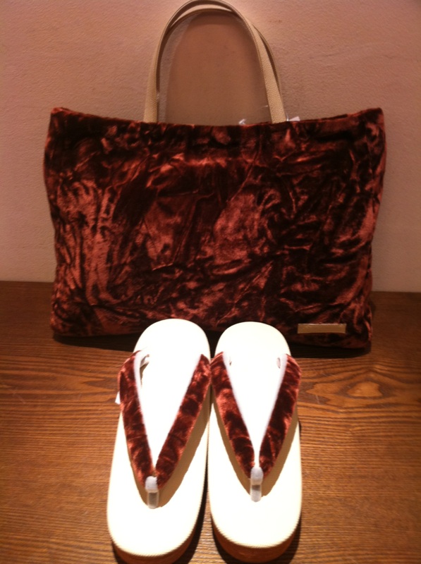 ベロア素材の鼻緒を使ったカフェぞうりと、鼻緒と同素材のサブバッグを入荷致しました。