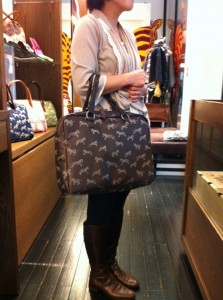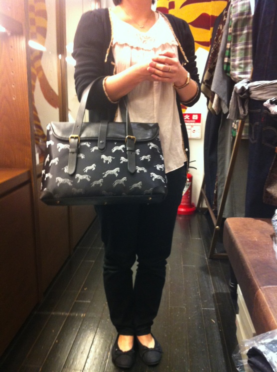 春まで後もう少しというタイミングで、新作バッグが入荷致しました。名前は「M-1(エムワン)」と申します。M-1は、持ち手の長さを調節していただけるので、肩から掛けていただくことも可能です。また、コンパクトなわりに荷物がたっぷり収納できるデザインになっておりますので、女性向きのデザインかと思います。身長が145.6cmの小さな竹内が持っても大きく見えないのですが、A4サイズの書類が入るのです。